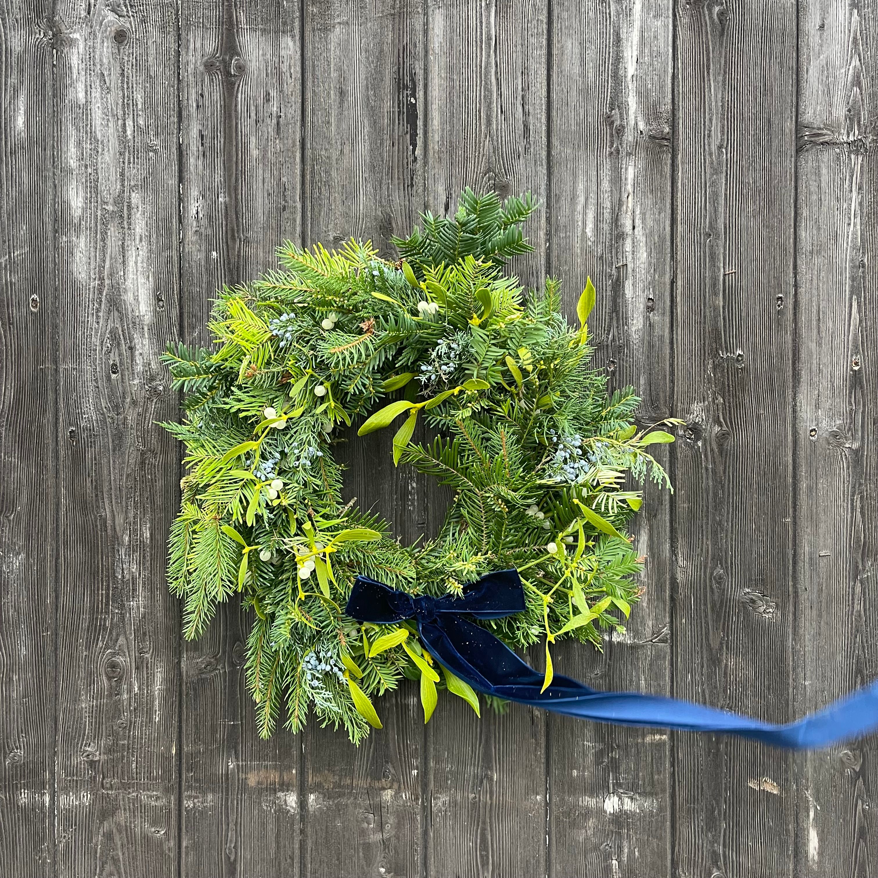 Flourish style whimsical wreath made with greenery from around the farm including Yew, redwood, box and other conifers, with a velvet ribbon. Medium size is 40-45cm wide. Please note that these are made to order. This photo is an example. Each wreath is completely different.